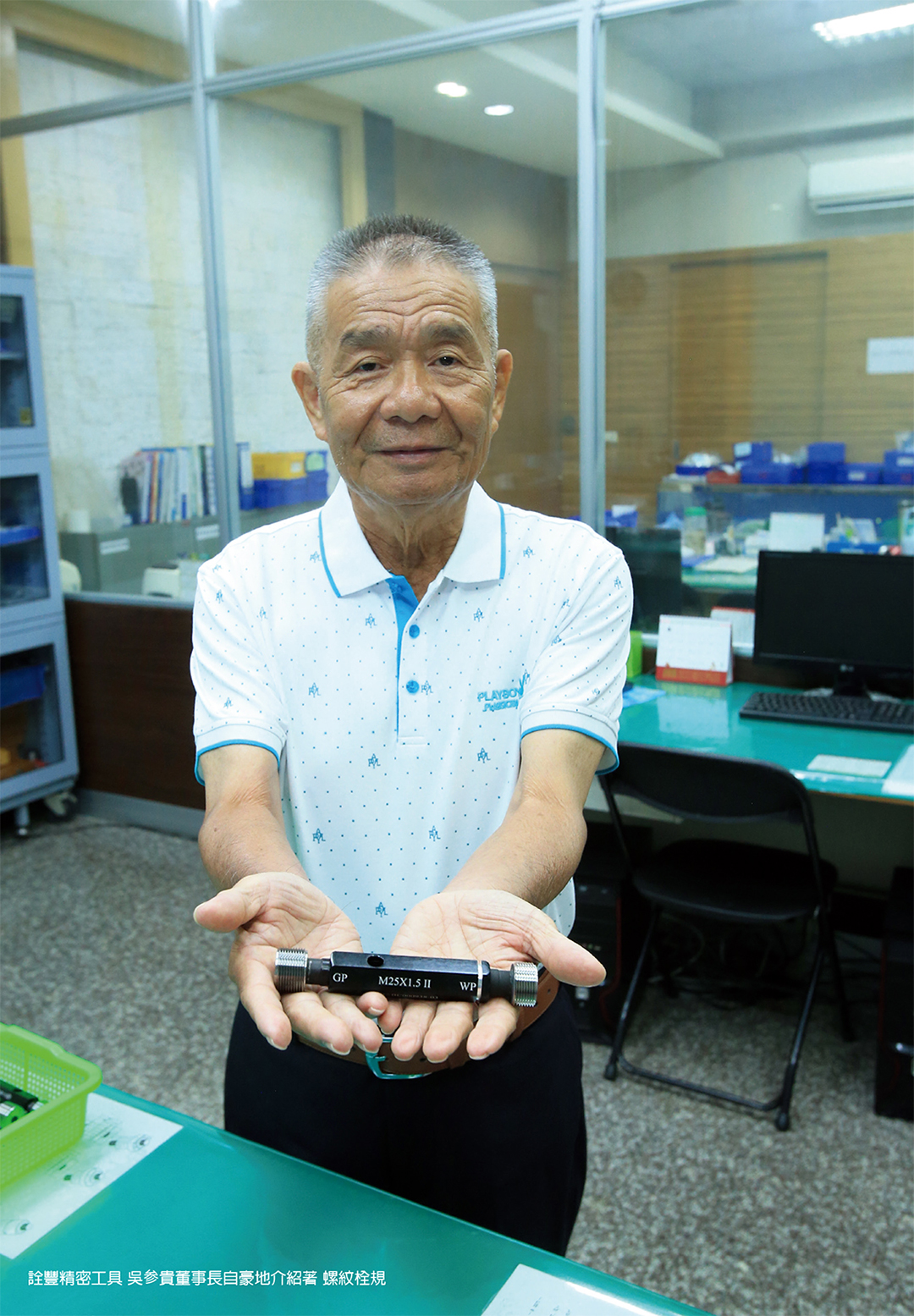 「有一天下班前上廁所發現裡面臭氣沖天,我就索性拿起水管把廁所洗了一遍。剛好被日本課長看到……」,就這樣不計較常常多做一點,這位肯吃苦耐勞的吳小弟逐漸被主管們所重用,在公司擔任起了品保小主管。要能夠把關公司產品的品質,必需精通所有量測的技術,於是他對於螺紋栓規、螺紋環規、螺紋同心規等工具的操作,乃至螺紋三針測定法等量測的手法逐步駕輕就熟,成為了公司裡重要的角色,全心投入為公司在台灣開創新事業。服務了好幾年後,他看到了自己創業的機會,於是在老主管的支持之下創立了詮豐,伴隨著瀟灑迴旋的圓舞曲,跳起了屬於自己的螺紋華爾滋。