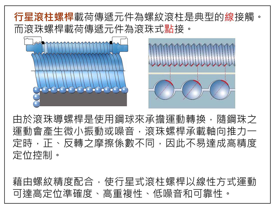 「行星式滾柱螺桿」相較於傳統的滾珠螺桿,具線性運動精度高、高剛性、出力大、壽命長、高負載、低背隙、定位精準等特點。值得強調的是,它沒有滾珠螺桿之鋼珠回流裝置,在頻繁改變方向和高線速度、低背隙、低噪音需求的應用中表現大為出色。詮豐生產的行星式滾柱螺桿工件直徑最小可達到12mm導程為2.0mm,最大可達工件直徑120mm導程50mm,轉造級工件最長可到6米,精密級工件最長可到2.2米。 關於行星式滾柱螺桿如何導入機械設備,吳董事長說:「由於行星式滾柱螺桿的機構設計是由1支大螺桿以及9到12支不等的小螺絲所組成,其與傳統滾珠螺桿相較,在螺桿直徑相同的情況下,滾柱螺桿的螺帽尺寸會比滾珠螺桿的螺帽尺寸來得大一些!這一點,往往讓銑床、磨床、加工中心機、沖壓機、放電加工機等機械廠的設計人員第一時間就覺得麻煩,不願意調整機台結構設計做導入使用,實在非常可惜!」他接著說:「你們不要忘了,滾柱螺桿的出力可是滾珠螺桿的三倍大!如果因為同尺寸螺桿的螺帽過大放不進機台,那為什麼不想想改用小一級的滾柱螺桿?如此不只螺帽空間的問題得以解決,其剛性表現還有機會超過原有的設計。這就是『滾柱』的魅力啊!」